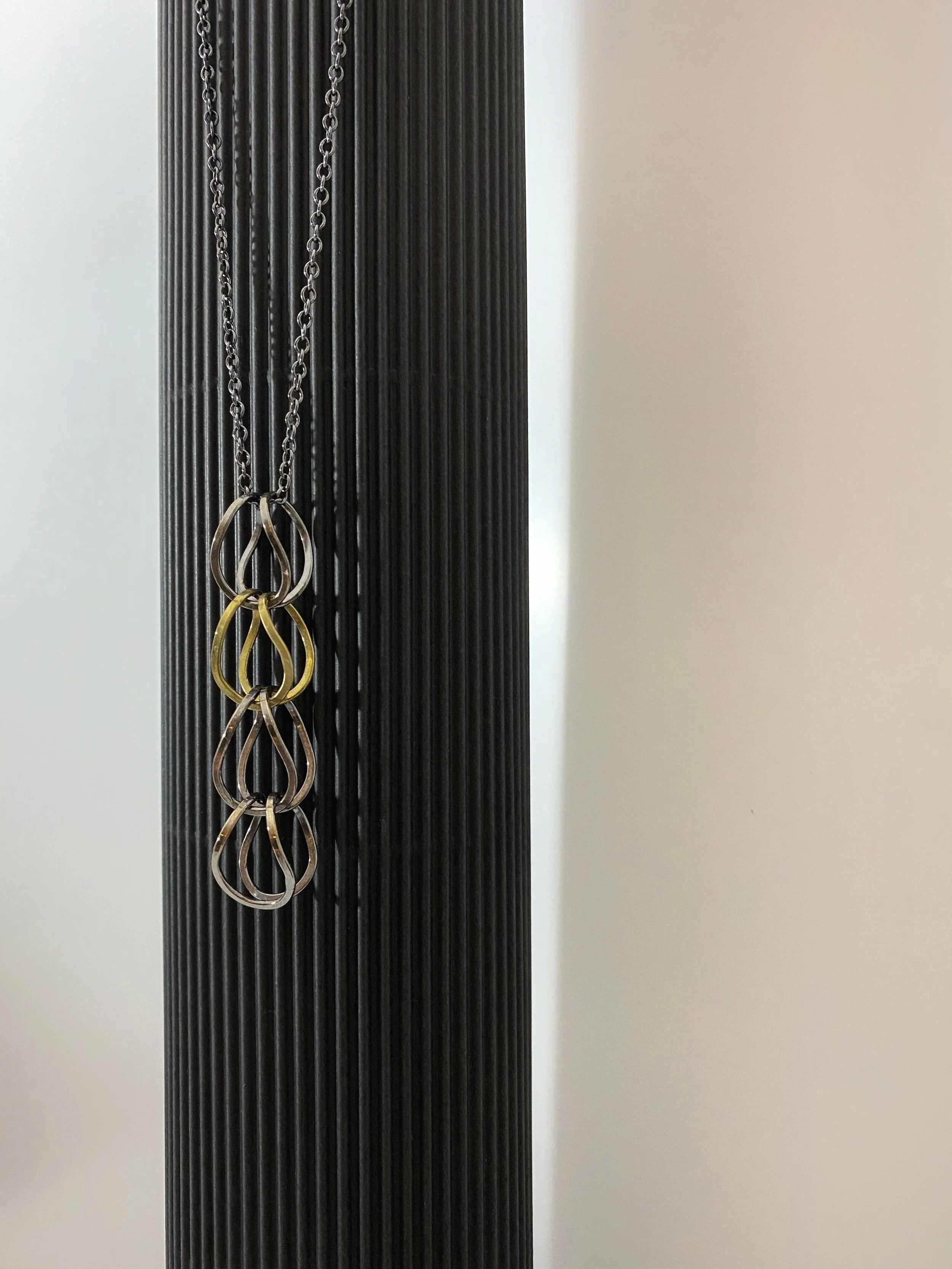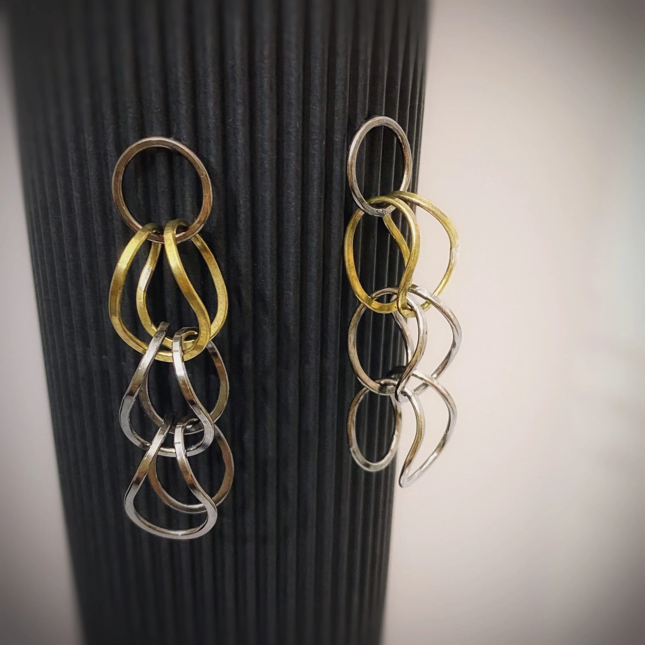 The interlocking chain elements are contrasted with blackened sterling silver and 14K gold fill creating bold and beautiful statement pieces.
