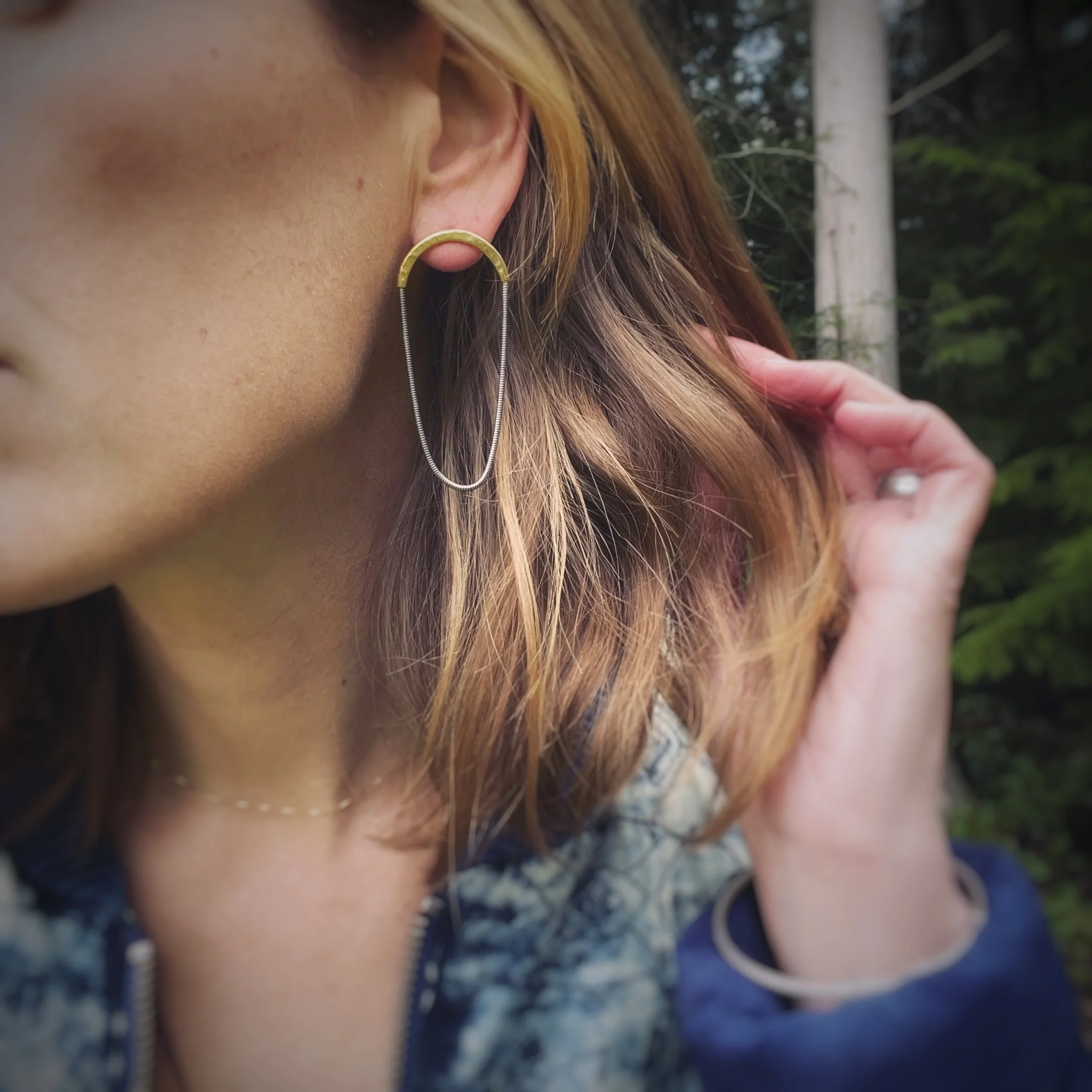 Oxidized (black) sterling silver snake chain and hammered brass tube shaped into simple arched stud earrings.